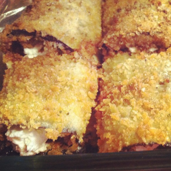 Bundles of lightly fried eggplant slices are filled with ricotta and smothered in tomato sauce for a bubbly, cheesy main course.