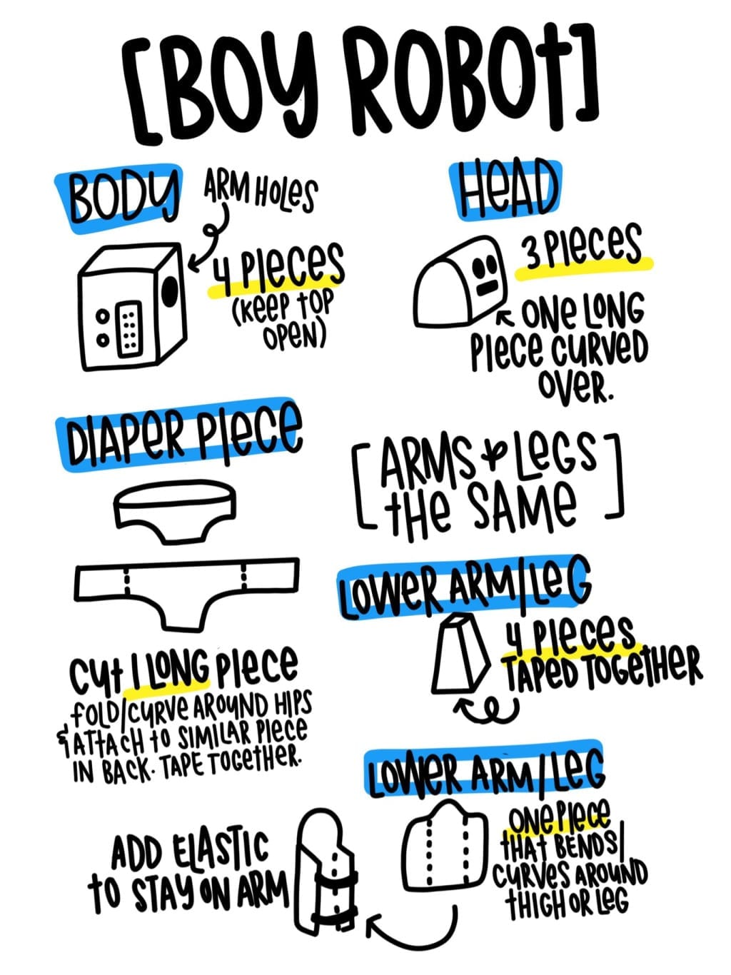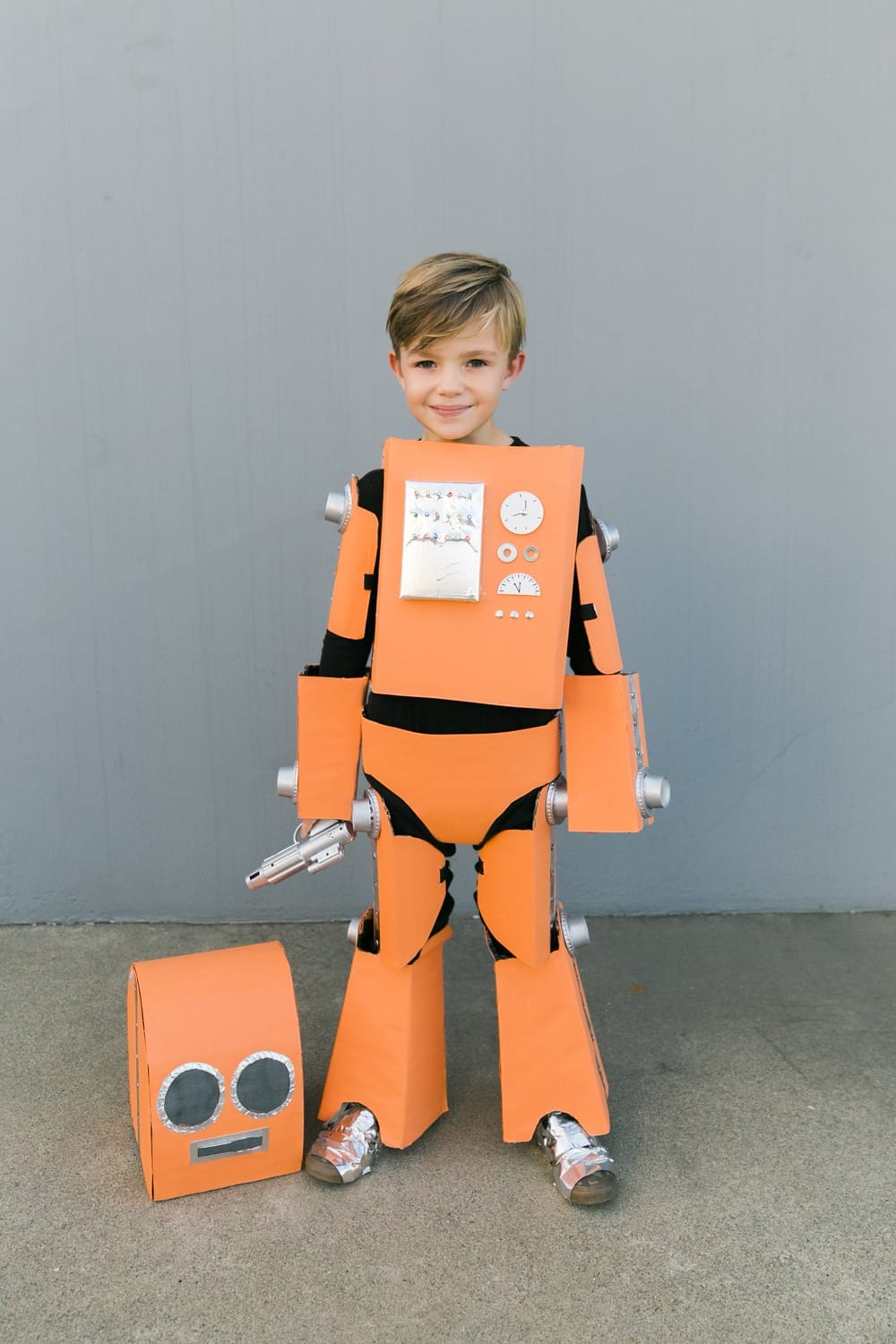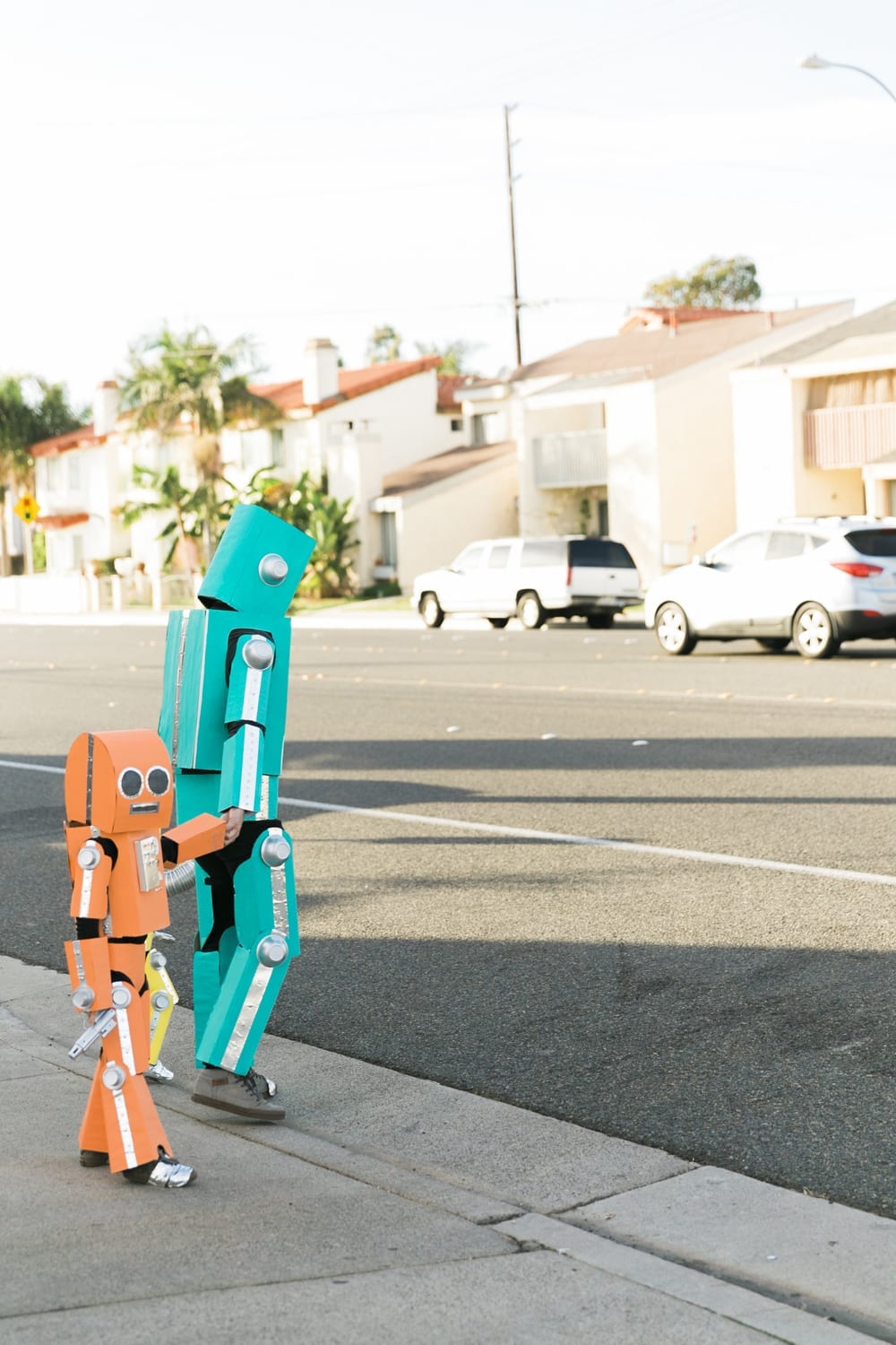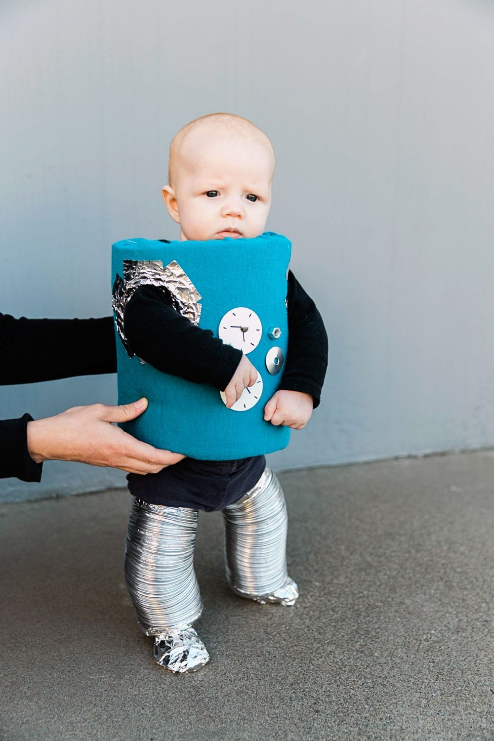 The baby bot costume was super easy and very comfy and soft. You can use a giant piece of foam, cut arm holes out, wrap it in fabric and then add accessories around it that match all the other robots. Then, use extra tubing for the legs. Be sure to tape off the sharp edges of the tubing with duct tape to ensure they don’t cut the baby. Now, in order to secure the back; puncture small holes in the foam and use thin pieces of fabric as a string. Next, tie it shut in the back. Don’t forget to decorate the robot costumes with levers and valves using paper and colored markers.