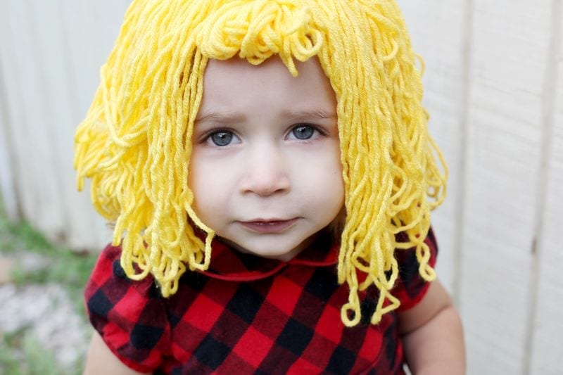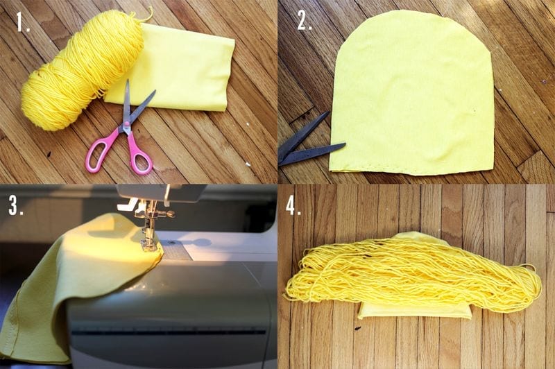 You’ll need yellow jersey fabric, yellow yarn, your sewing machine or a needle and a thread. Next, you’ll cut the yellow jersey fabric into the shape of a hat; you can achieve this easily by tracing a hat from your closet. Now, you can use your sewing machine to stitch the outer edge of the hat. Finally, pull the yarn from your skein. Make sure you pull as long as your arm length. Once you’ve established a good amount, locate the center and lay it flat. Create a middle part, by stitching the yarn to the hat from the front to the back. Continue stitching until it is fully covered.