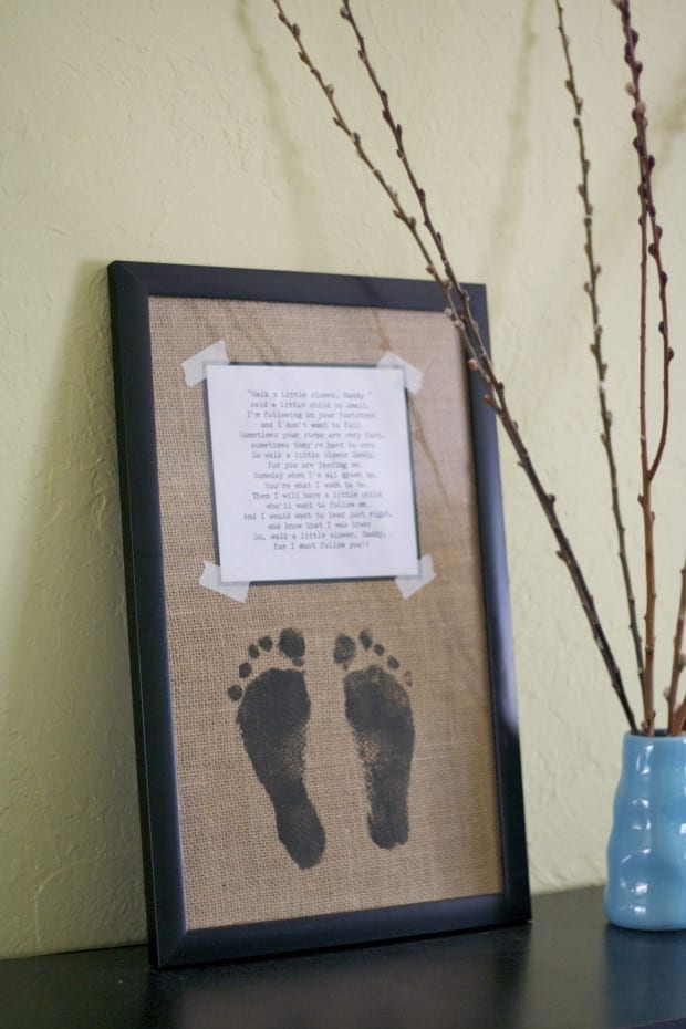 I used an 11″X17″ frame from Walmart. I bought a piece of burlap that was 1/3 yd. I cut out my burlap to the size of the frame. Use the print that comes in the frame as your guide. Lay it down on a piece of newspaper. Get some black acrylic paint and paint some on the bottom of your child’s feet, but be careful not to gob it on or go too light.