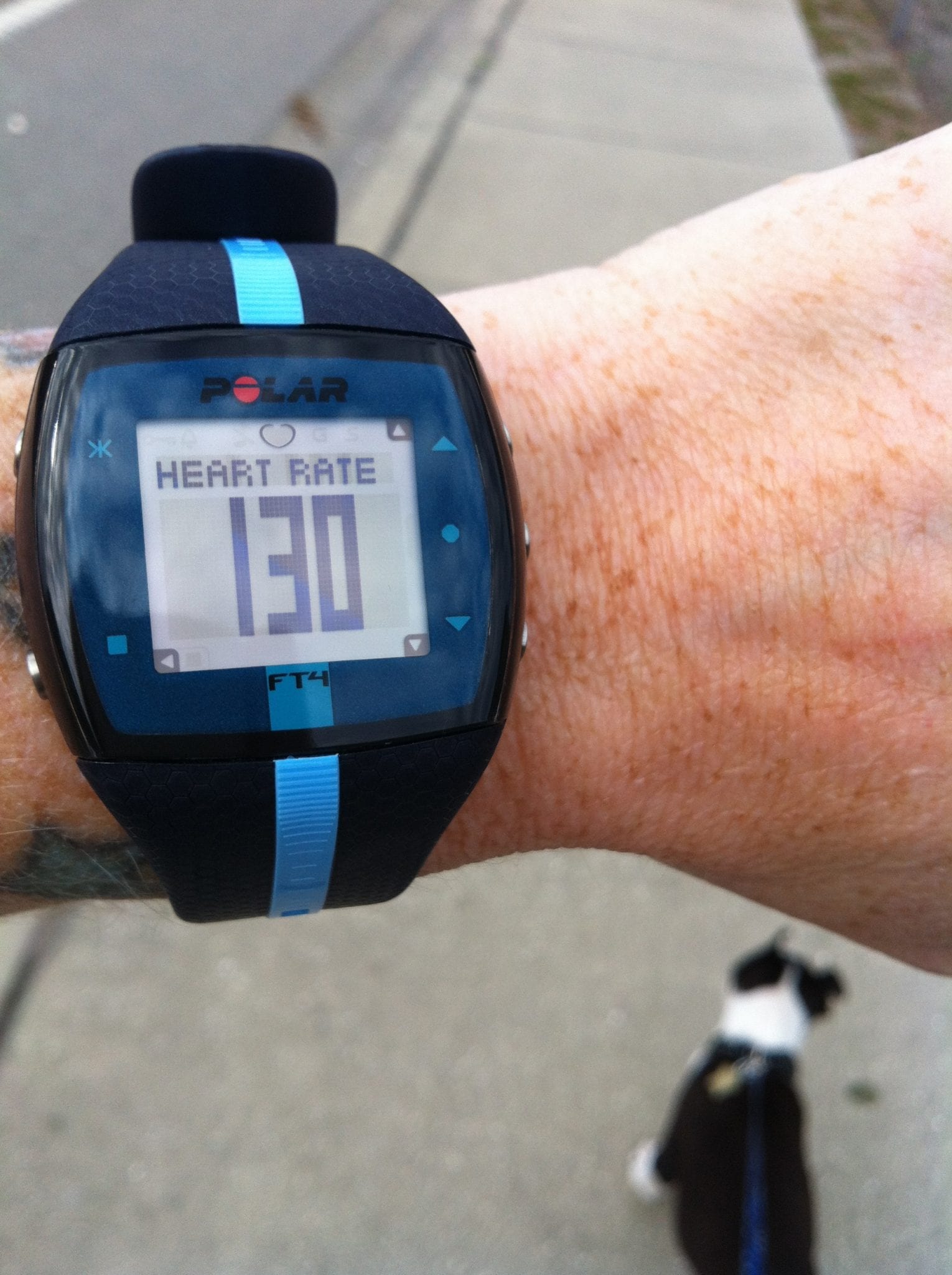 Here is a photo of the Polar in use as I am walking with the dog (see Oscar at the bottom?!). This shows how the device displays your heart rate as you are exercising: