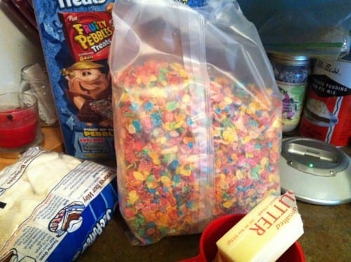The idea didn’t really come to my mind until the other day, while at the grocery store, I spotted the fruity pebbles on sale for buy one get one free. Of course, I bought them and then immediately thought about what I am going to do with all that cereal.