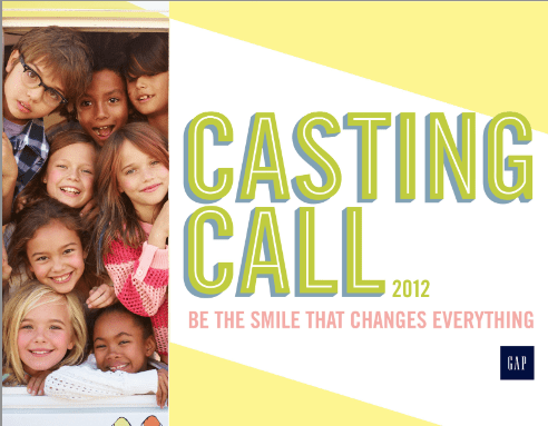 From April 2-22, 2012, parents can upload up to five photos of their baby (ages four and under) or kid (ages five to 12) and answer a brief question about how their child brightens up the world. Submissions are accepted at www.gap.com/castingcall, Gap’s Facebook page at http://www.facebook.com/gap, or via the Gap Casting Call app available for iPhone and Android.