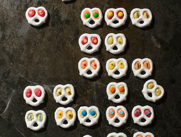 These bug-eyed beings are easy to make in large batches for a Halloween gathering or classroom party. Place yogurt pretzels on parchment paper. Heat candy melts according to the package directions. Spoon each color into a ziplock bag and snip off one tiny corner. Let the candy cool for a minute, then pipe it into the holes as shown. Before the filled areas set, add sprinkles or small candies for pupils.