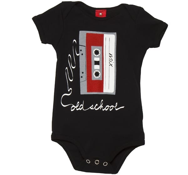 23. Little Trendstar Old School Onesie – website: http://www.littletrendstar.com | paying hommage to the classic mix tape, this screened design showcases a cassette tape image and the words “Old School” on a black onesie.