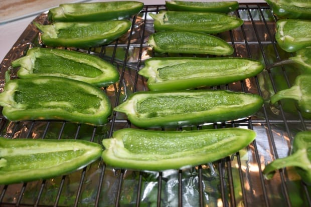 - Place jalapenos on wire rack; broil for about 10 minutes or until they start to char. Cool completely. (mine took 18 minutes depending on size)