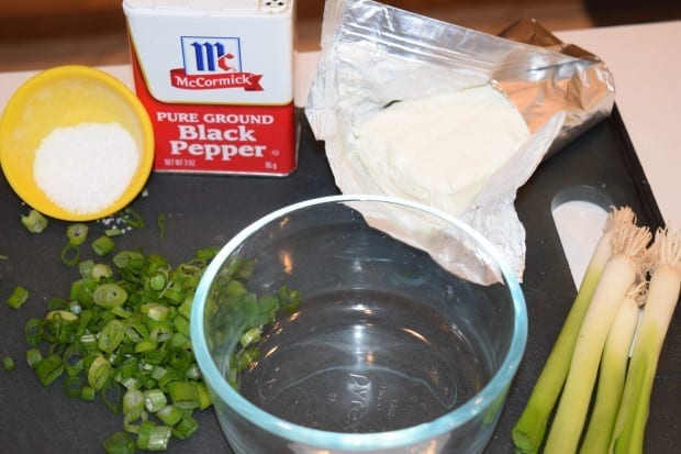 - In a small bowl, mix cream cheese, and green onions. Add salt & cracked black peppercorns taste, mix. Set aside. (best next day)