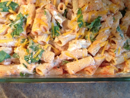 2. Drain Rigatoni and pour into a large bowl. Mix in Ricotta Cheese, 3/4 of the jar of Rose Cream Sauce, spinach and mix together.