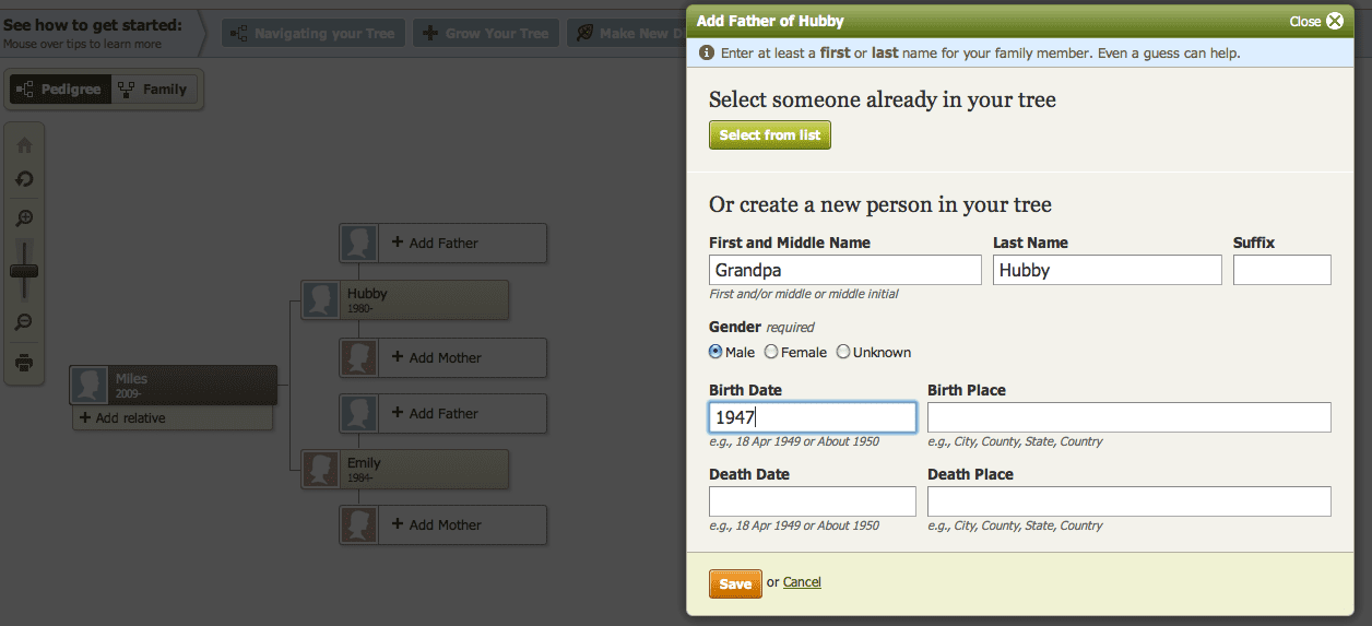 I clicked on +Add Father above Hubby, and a box popped up and I filled in some basic information.