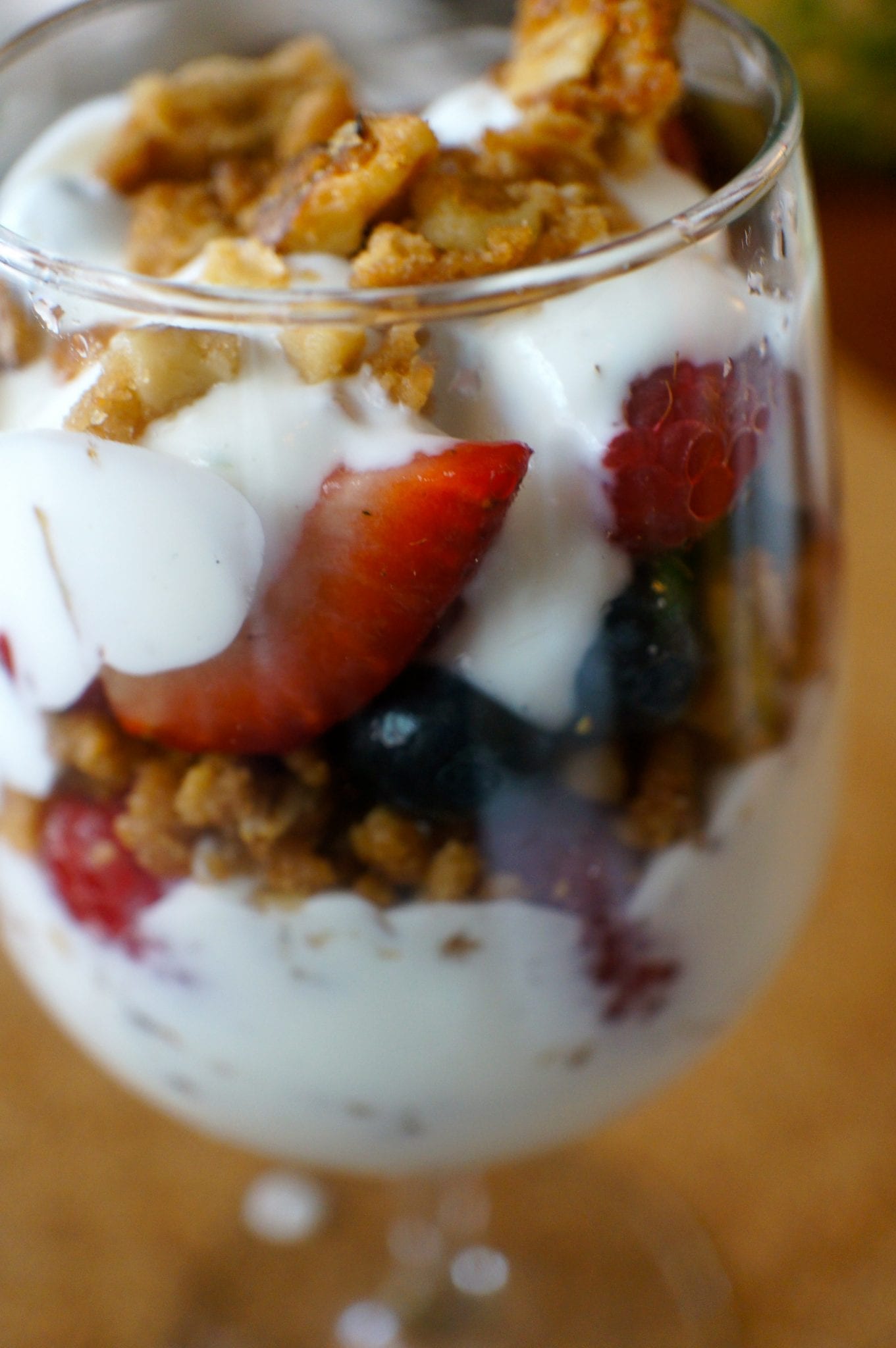 Layer cream, streusel topping and fruit parfait or wine glasses and garnish with mint.