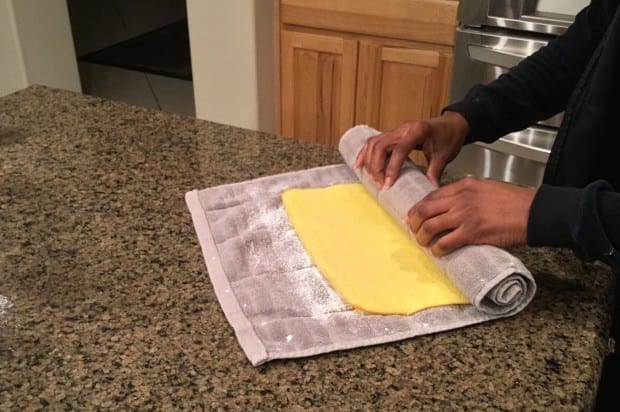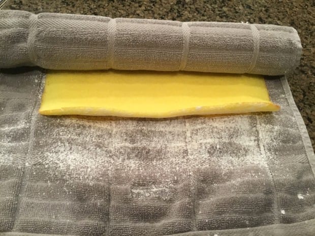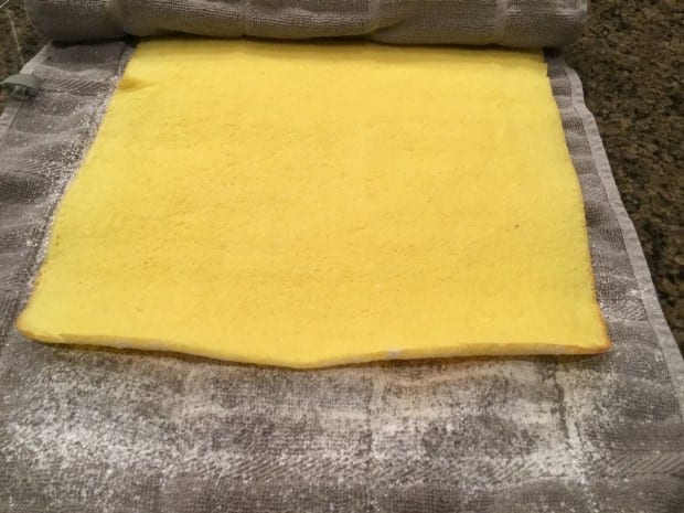 - Working at the short end, fold the edge of the towel over the cake. Roll tightly, rolling up the cake into the towel. Let cool completely while rolled, at least one hour.