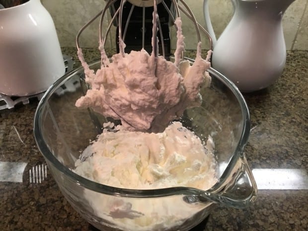 - While the cake is chilling, make the filling. Beat the heavy whipping cream and powdered sugar until stiff peaks form. Note: ( I usually make whipping cream first )