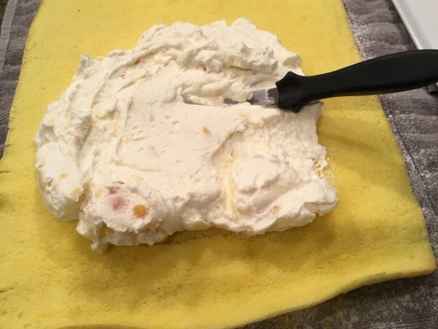 - When cake is cool, carefully unroll the towel. Spread the lemon curd whipped cream over the cake.