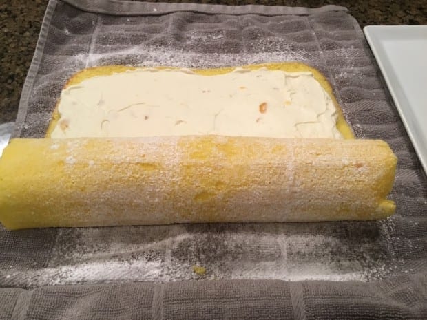 - Gently but tightly, re-roll the cake and wrap in plastic wrap or foil. Chill until it firms up a bit, at least one hour or overnight. Sprinkle with powdered sugar. Slice and serve. Cake will last covered in the refrigerator for up to 4 days