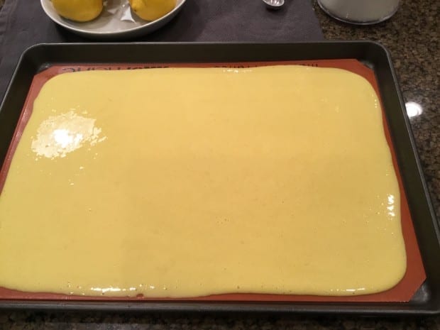 - Spread in prepared pan. Batter will be in a very thin layer and you will need to use a spatula to spread it to all the corners of the pan evenly. Bake for 8-11 minutes (mine took *8).