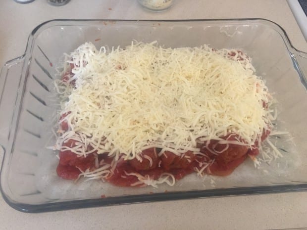 Spray your 9X13 pan with cooking spray. Once meatballs are cooked place the sauce and meatballs in the center of baking dish. Sprinkle the mozzarella cheese and Parmesan cheese on top.