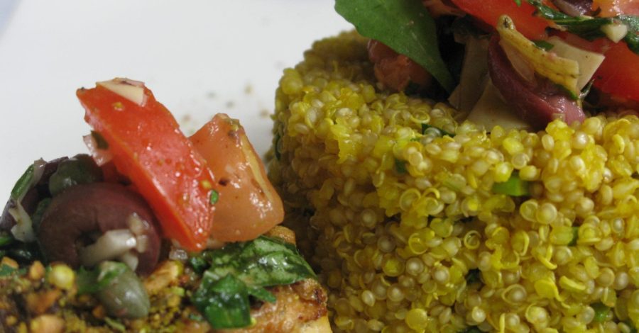 Creating a pilaf by adding vegetables and herbs to a grain is a simple way to take the flavor of your dish to the next level. The saffron adds a beautiful color and unique dimension to the quinoa. If saffron is not available, feel free to leave it out – you will still have a lovely pilaf to compliment the Mediterranean Pistachio Crusted Tofu.