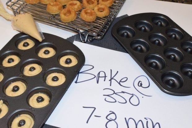 - I recommend using a large pastry bag or ziplock bag for ease, as shown in the video. Cut a corner at the bottom of the bag pipe then batter into each donut cup, filling 2/3-3/4 of the way full