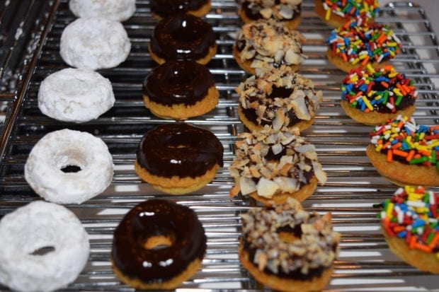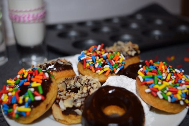 - Dip the tops of the donuts into the chocolate glaze and then cover with sprinkles. ( I simply poured the sprinkles into a deep bowl and dip the tops of the donuts into it.