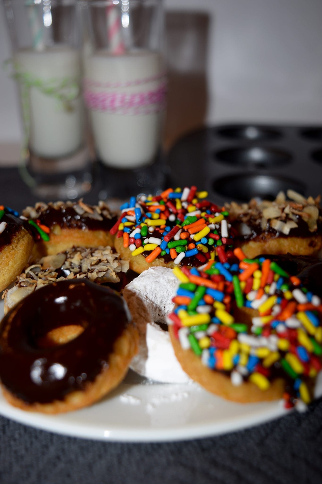 These little mini donuts are AMAZINGLY DELICIOUS!! Beyond tempting and scrumptious, you’ll forget there BAKED! Light and fluffy vanilla donuts dipped in chocolate ganache glaze topped with sprinkles, toasted coconut or whatever your heart desires. Fun and easy to make. Great alternative to a “semi-healthy treat” kids will surely love. Guilty pleasure with out any guilt. The best part because there smaller, You can eat more!