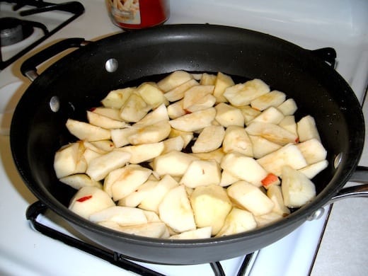 Peel your apples, slice ’em in half, and then cut around the core. Toss them into a large skillet, cover with water (some of your slices will float), and then cook on medium heat for at least 15 minutes. I did mine for 30.