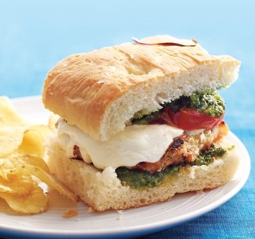 Rethink your burger: Tomatoes and fragrant pesto give this sandwich a delicious twist.