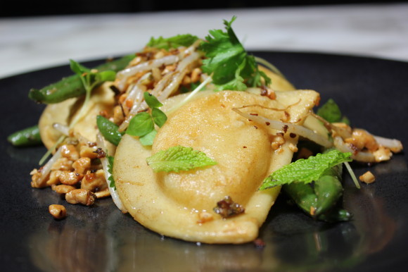 Potato & Onion Pierogies with Green Beans, Cashews and Thai Chili
