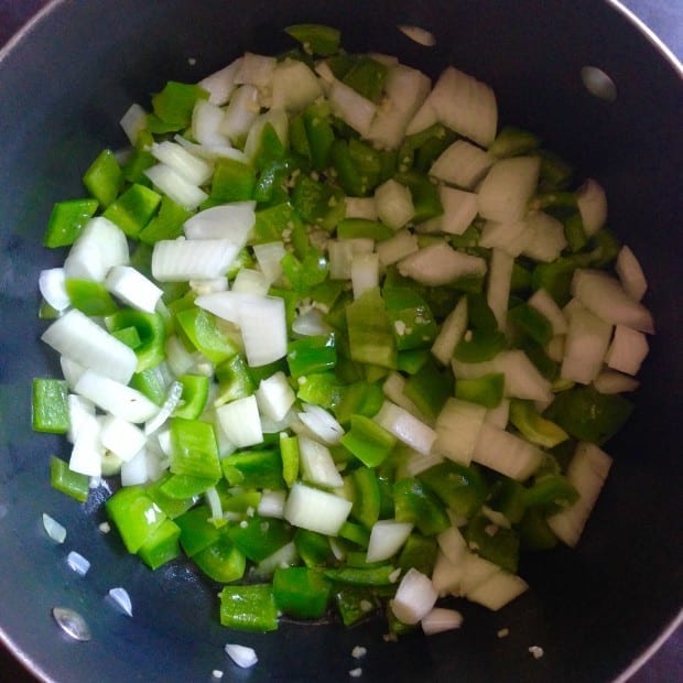 In a large pot over medium heat, heat the olive oil and saut the green peppers and onions for 5 minutes.
