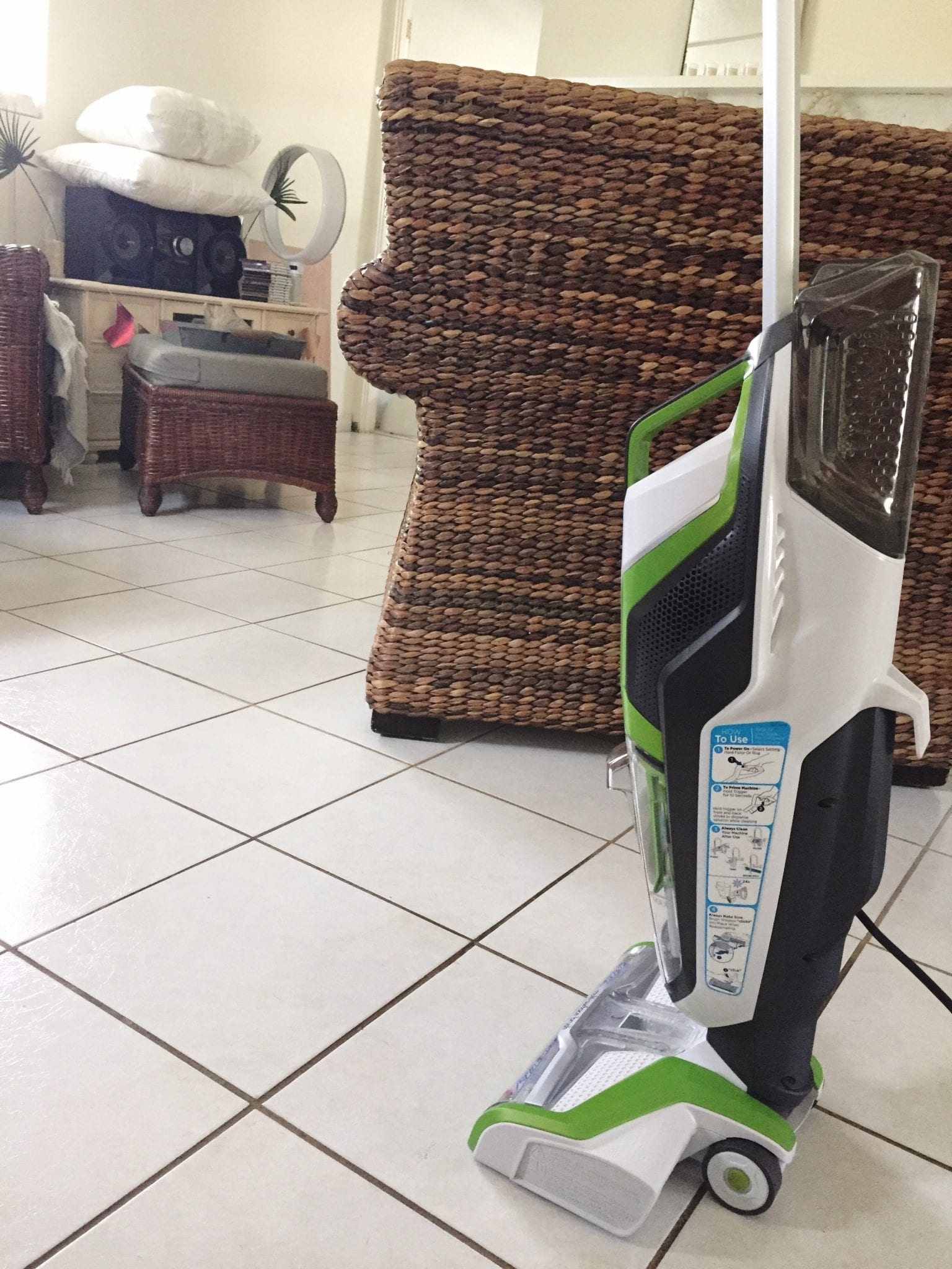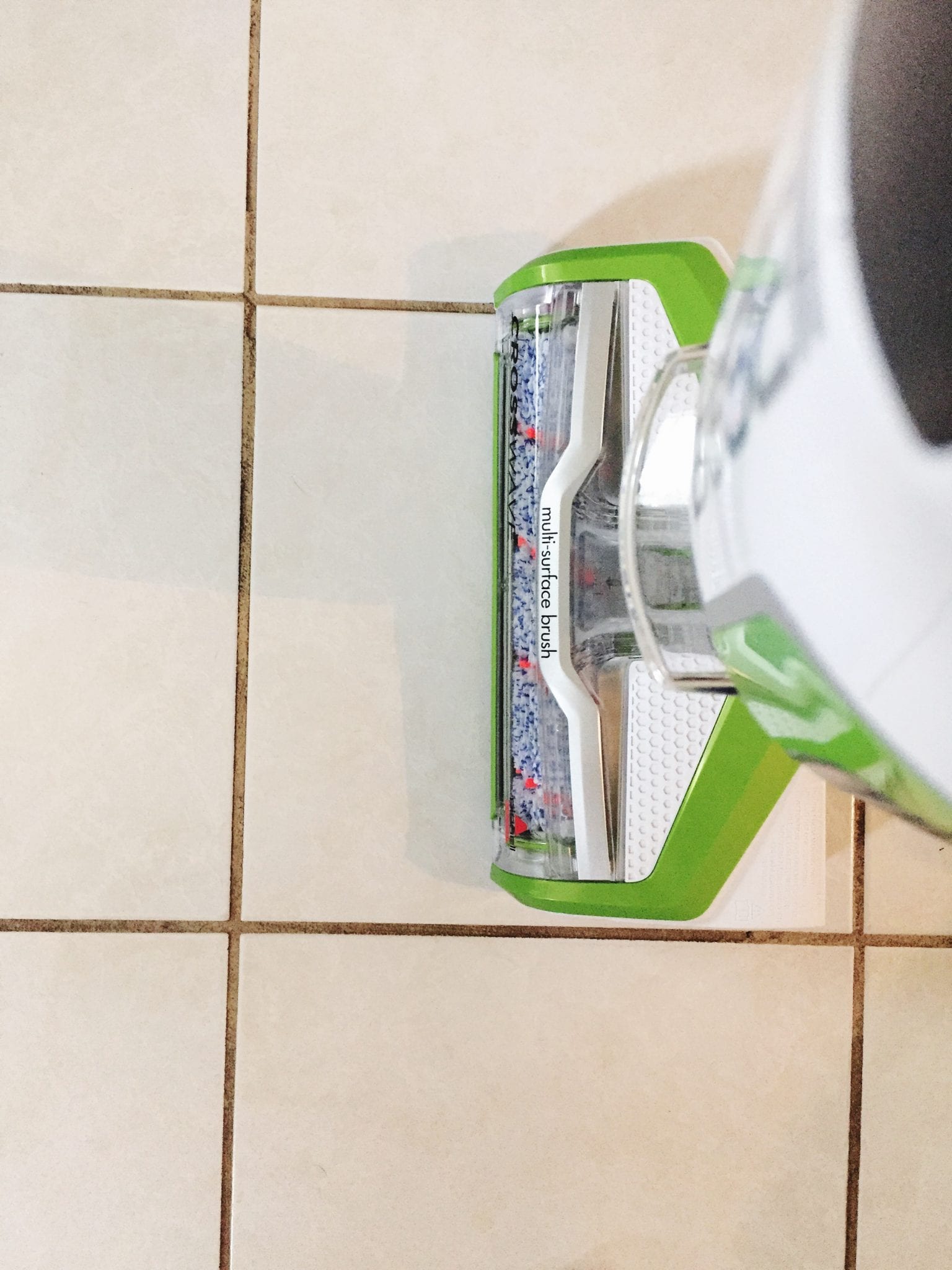 I have been searching for over a year for a vacuum/shampooer for my floors and area rugs because we have a lot of grout that was dirty when we bought the house (Yay for unsealed grout!). I began to use a power cleaner when I decided it was too daunting of a task since our WHOLE house is full of this tile with nasty grout. After no luck on finding anything that would easily do the job – and after refusing to pay a professional cleaner – I decided to get on my hands and knees and try different cleaning solutions and methods. While they were successful, the task was so tedious and physically demanding. I have lower back problems and it doesn’t take much to put me out.