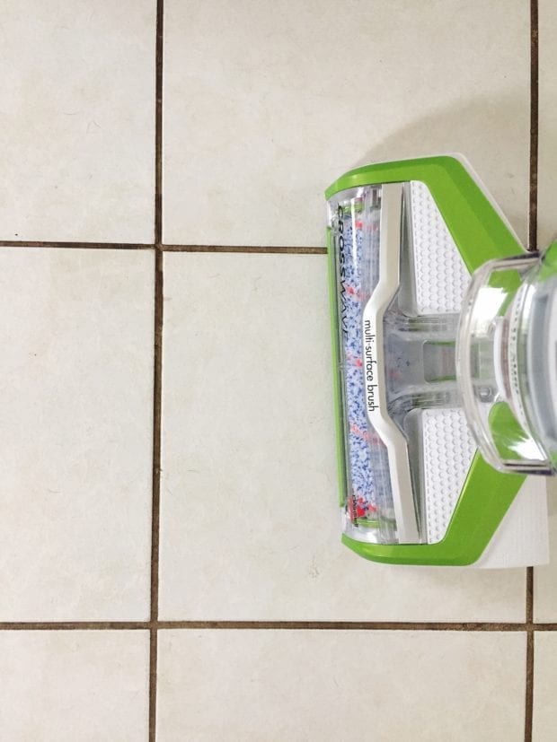 I have been searching for over a year for a vacuum/shampooer for my floors and area rugs because we have a lot of grout that was dirty when we bought the house (Yay for unsealed grout!). I began to use a power cleaner when I decided it was too daunting of a task since our WHOLE house is full of this tile with nasty grout. After no luck on finding anything that would easily do the job – and after refusing to pay a professional cleaner – I decided to get on my hands and knees and try different cleaning solutions and methods. While they were successful, the task was so tedious and physically demanding. I have lower back problems and it doesn’t take much to put me out.