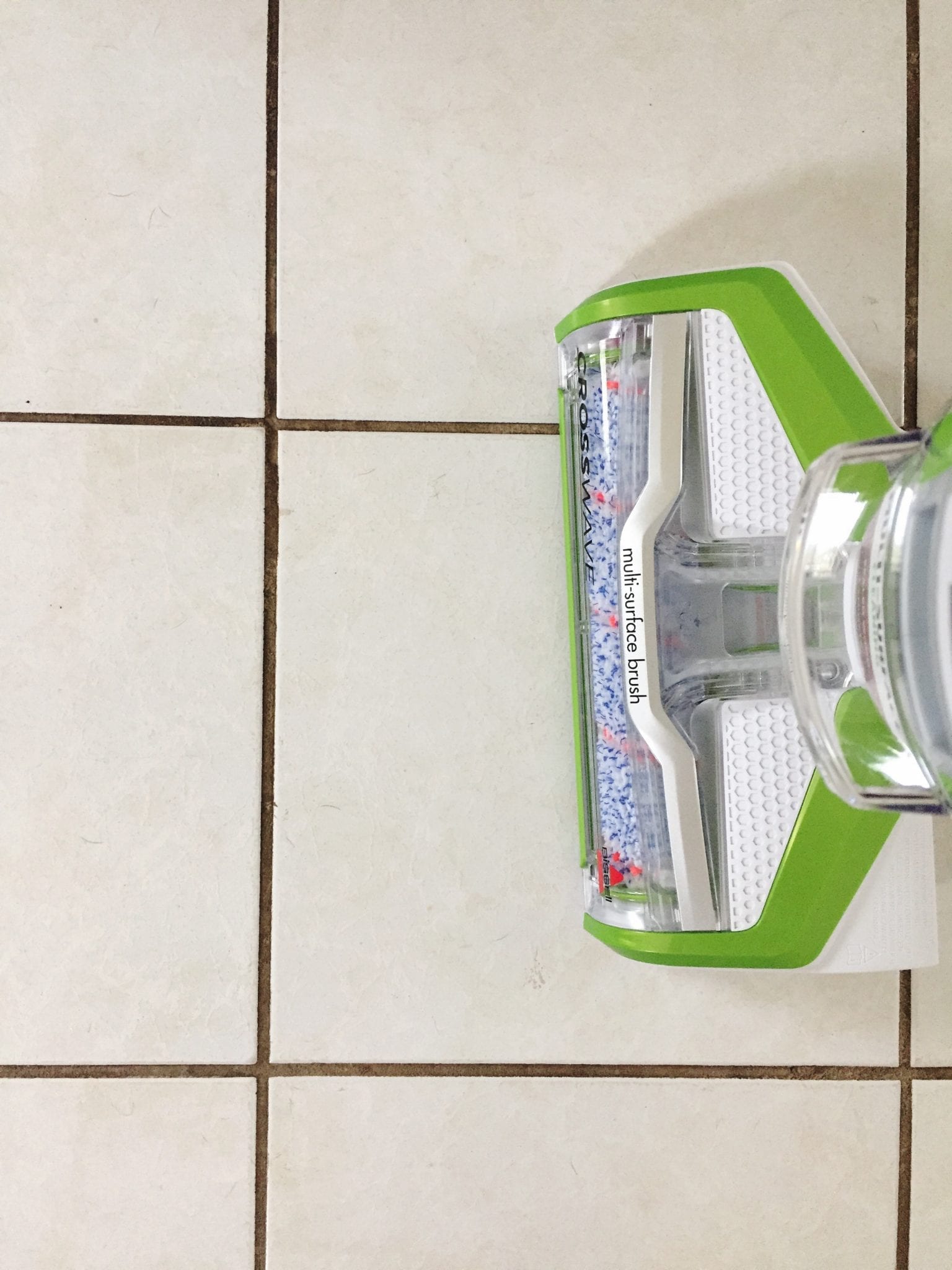 I noticed the effect immediately, even with the floors being wet. The brush couldn’t reach into the deeper parts of the grout (thanks to not-so-great tile work), but it was able to clean a larger part of it. I plan to go over it several times before adding in the extra cleaning by hand, but overall, the Bissell Crosswave is an excellent investment and is a very effective product that requires little effort on your part. It took me no time at all to clean several hundred square feet of my house and I honestly can’t wait to tackle the rest. The Bissell Crosswave makes the work easy so much that I don’t dread it. You can see in the photos below some before and after results as well as the dirty water that it suctioned back up.