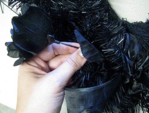Time to put the heads on. To attach the heads to the wreath, you will need to poke a hole in the back. I just used a piece from the roses that I had cut off, and poked a hole about a quarter to half-inch into the back of the head.