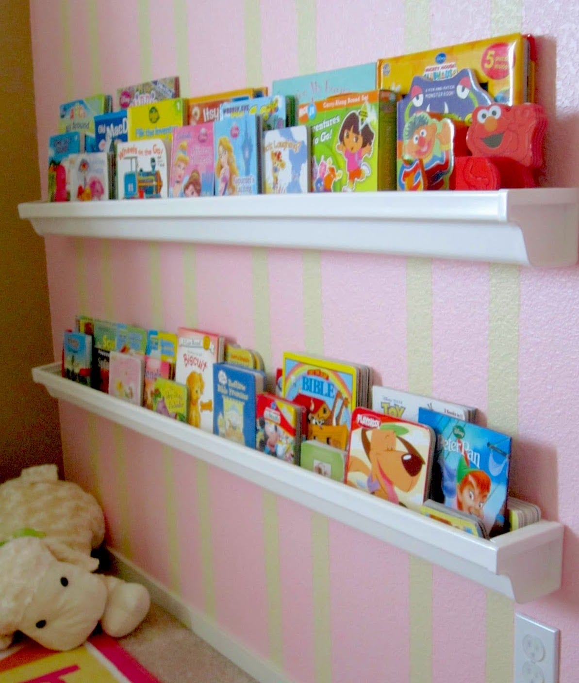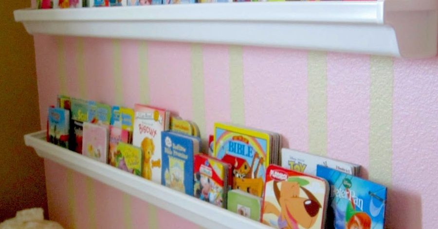 One 10 ft vinyl rain gutter will cost you just under $6, and a set of caps (what you attach to the end of each shelf) are also just under $6!! So for around $12 (assuming you make one 10 ft shelf instead of cutting it in two like I did) you can transform your walls into a book gallery for your little one/s!