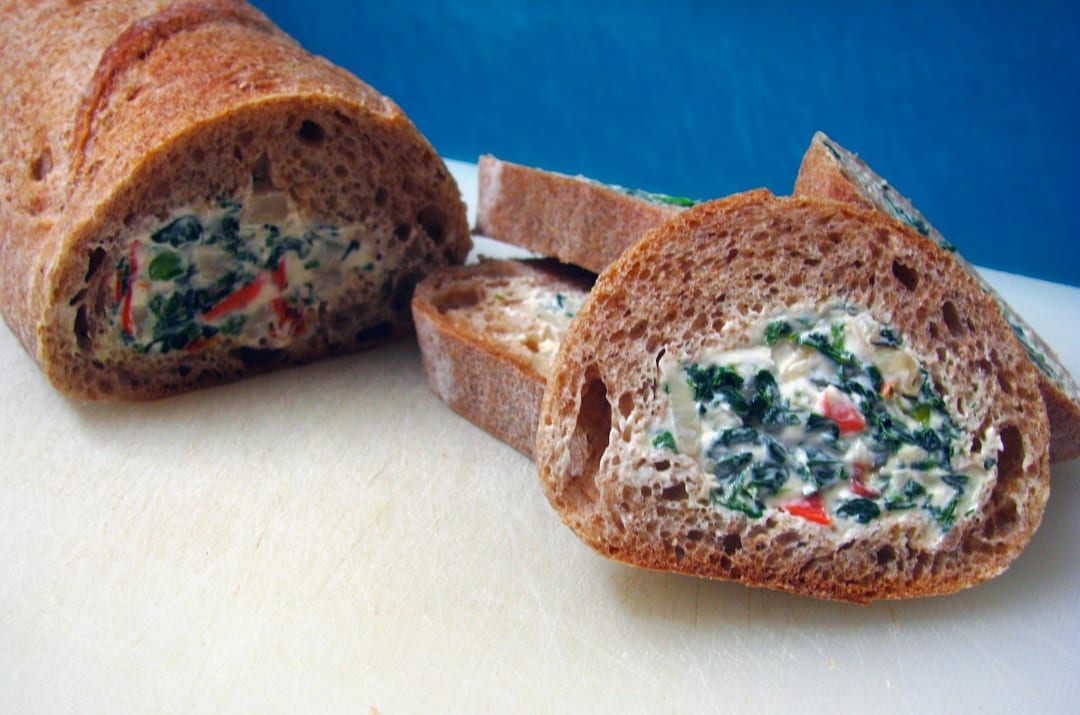 I was browsing around on Pinterest and found this brilliant little idea. Baking Obsession posted a stuffed baguette recipe, and I was in love! I decided I had to try it out right away. It’s a fun way to serve bread and dips! Vera used a goat cheese stuffing, but I went with my favorite spinach dip. I’m throwing in the recipe, just in case you don’t have an easy one handy. The best part about this spinach dip, is how ridiculously cheap it is (and ridiculously good too!).