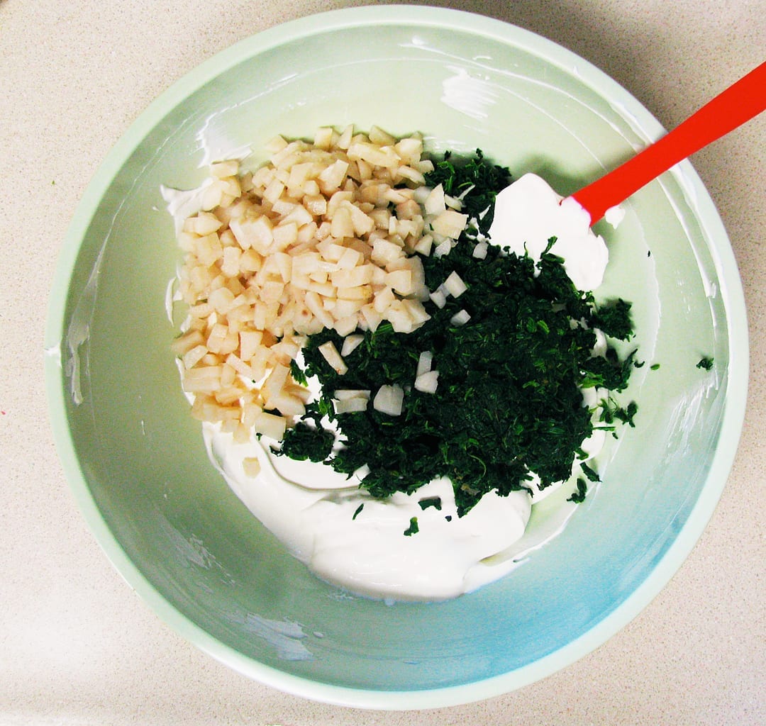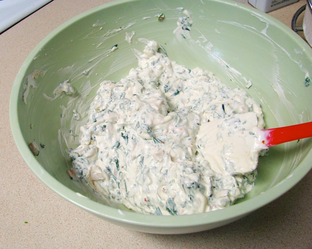 Now, you have a perfectly delish spinach dip and you can put this in the fridge to chill for a couple of hours before serving (if you can wait that long). OR, you can keep following along….