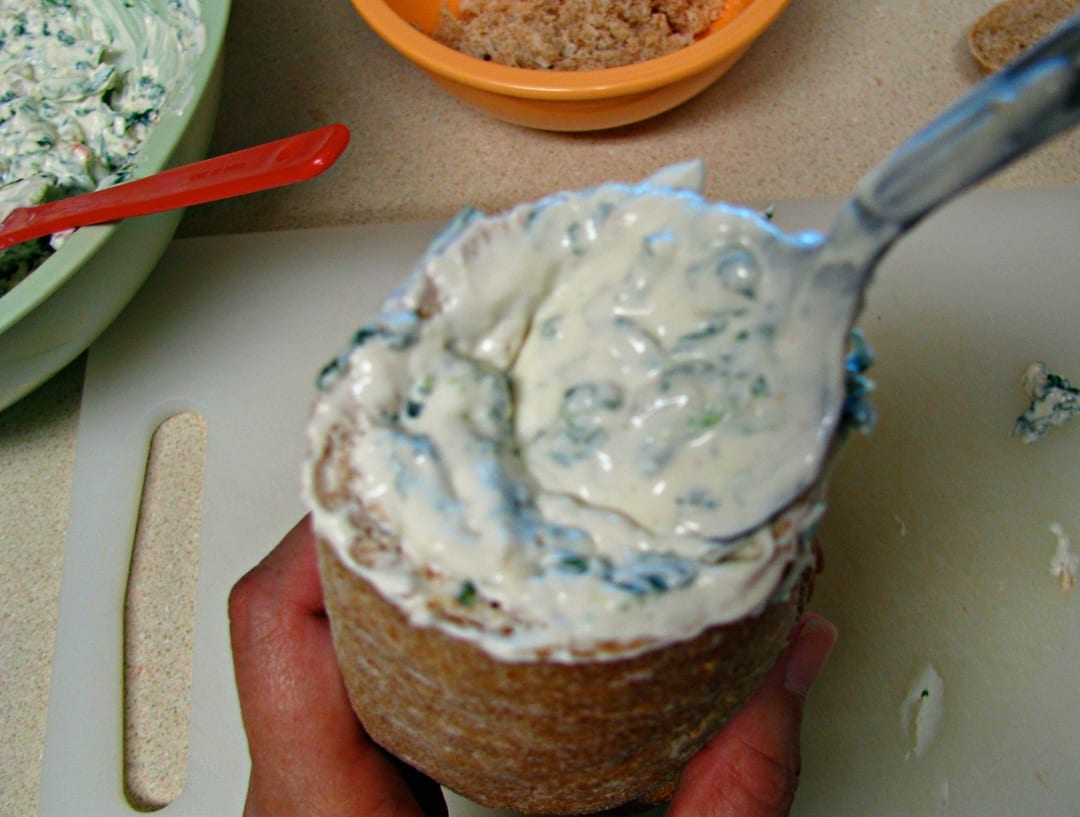 This is basically the recipe off the back of the Knorr brand dried Vegetable Soup mix. But, let me make a recommendation for you…..skip the vegetable soup and try it with Knorr’s Leek Soup mix. Trust me. It tastes about 100 times better if you ask me! But, if you can’t find the Leek Soup mix, the vegetable won’t let you down either. I also made some other adjustments to make the dip a little bit easier to stuff inside the bread.