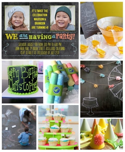 L to R: Tiny Prints Party with Us invitation, Punch Bowl, Cake, Chalk Favors, Decor, Chalk Games, Cupcakes, Party Hats