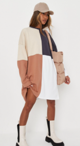 This glamorous oversized sweater dress projects more than a hint of the 1960s. The colorblock design adds funky asymmetry, while the dark neckline adds a little needed tonal balance.