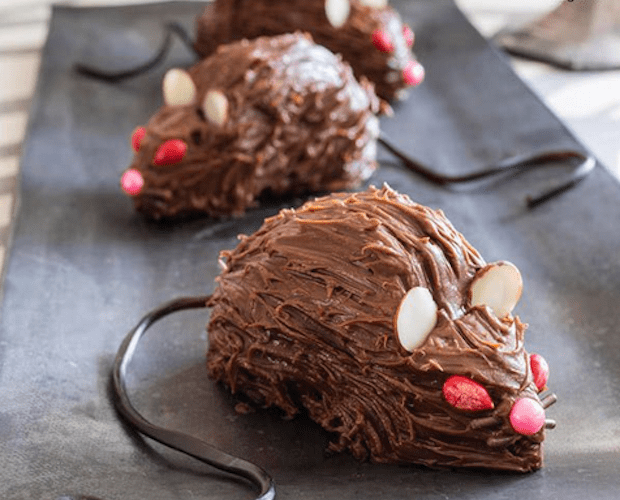 These treats, cleverly constructed from halved donuts, will provoke shivers of fright and squeals of delight. For each rat, trim half a cake doughnut as shown. Freeze it for a few hours, then cover it with chocolate frosting, working on cut surfaces first (skip the bottom), then the uncut areas.