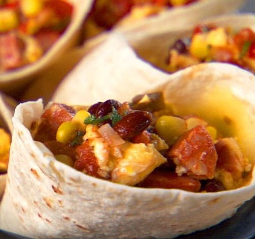 Fry the chorizo in a hot pan for 1 minute, then add the eggs and scramble. Meanwhile, sprinkle cheese over each tortilla.