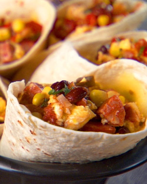 One at a time, fold the bottom edge of each tortilla up and over the eggs and sausage, fold in each side edge to form an open pocket, then fold down that edge. If not eating immediately, wrap tightly in foil.