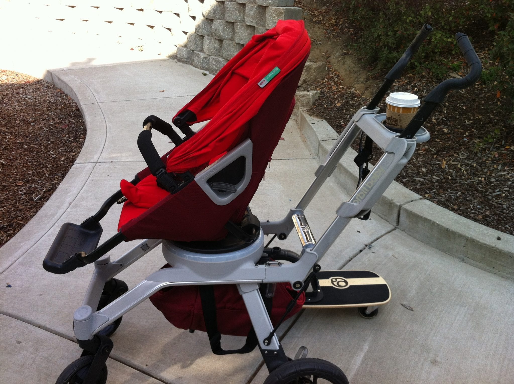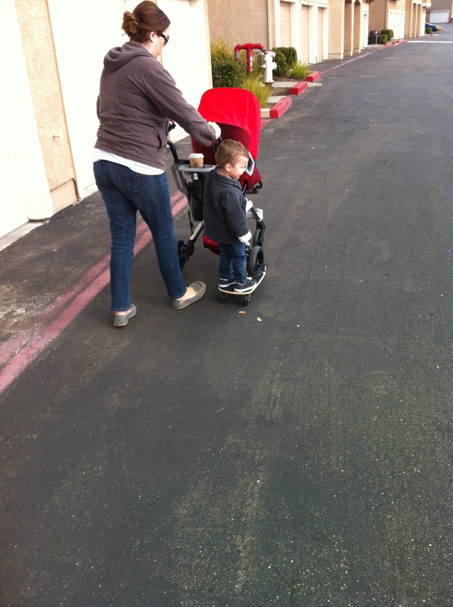 This awesome skateboard-esque attatchment is a must have if you have more than one child. With Miles and the two kiddos I nanny for, things get crazy when we go for walks. Having the Sidekick sure is great to help when one gets tired from walking, or to use as incentive for being on their best behavior. Let me just say that while I get plenty of compliments on the stroller by itself, that Sidekick is noticed everywhere we go! I have been stopped by parents at the kids schools, grandparents while out on walks, teenage boys (who seemed to be the most impressed!) and literally every person in our mall! No kidding. Stopped. It is just. So. Cool. Miles loved riding on the Sidekick too! Sometimes, I’ll take him out in the stroller and he ends up riding the Sidekick home. The sidekick attatched with ease, and folds up along with the stroller! It comes with handles for your little to hold on to while they ride too!