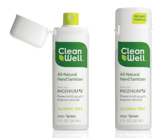CleanWell hand sanitizer kills germs with a patented formulation of essential plant oils. The active ingredient is thyme, which is proven to kill 99.99% of germs. See Jasmine’s review of Cleanwell.