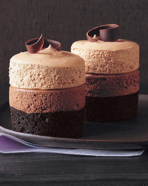 The dark-chocolate cake at the base is baked in ramekins. Two layers of plush, pillowy mousse — bittersweet and milk chocolates — are piped on top and capped with semisweet chocolate curls. Chill and serve as just the right sweet for your sweet.
