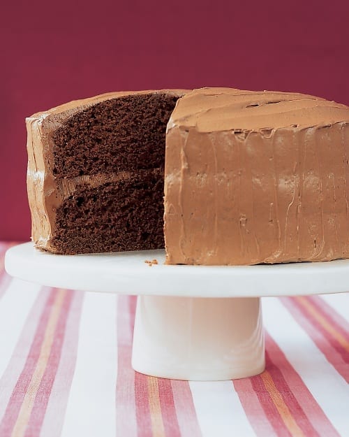 Make the cake: Preheat oven to 350 degrees. Butter and lightly flour two 9-inch round cake pans. In a bowl, whisk flour, cocoa, baking soda, and salt.